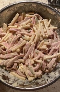 Wszystkie składniki kroimy w paski równej długości i grubości. Myślę, że tak 5 cm długości i 0,5 cm szerokości będzie idealne. Oczywiście tak na oko, bo przecież nie korzystam z takiej dokładności przynajmniej przy przygotowywaniu sałatek. Proponuję najpierw przemieszać wszystko bez dodatku majonezu, ewentualnie z octem jabłkowym. Octu wystarczą ze dwie łyżki, nie więcej. Po prostu na sucho składniki się łatwiej przemieszają, potem będzie trudniej. Do przemieszanych składników dodajemy kilka łyżek majonezu, sól i pieprz do smaku. Ser i mortadela są dość suche więc ze 4 łyżki majonezu trzeba dodać. Sałatka jest bardzo dobra w smaku, lekko octowa, ale przy serze żółtym i mortadeli, to nawet pasuje, do tego octowości nadają również ogórki konserwowe. Ja już nie dodawałem ziemniaków, jak to jest w niektórych przepisach. Znalazłem również, że zamiast ogórków konserwowych dodaje się kiszone i dolewa trochę tej wody spod ogórków. Może tej wersji kiedyś spróbuję, ale ziemniaków nie będę dodawać.