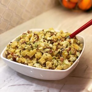 To chyba jedna z najprostszych i najsmaczniejszych sałatek jakie ostatnio jadłem. Spróbowałem jej na spotkaniu u znajomych i zakochałem się w tym smaku od pierwszego kęsa. Oczywiście sam już ją robiłem dwa razy. Jest obłędnie smaczna i prosta w wykonaniu. Do sałatki potrzeba 2 kg ziemniaków sałatkowych, 40 dag boczku, 4 lub 5 łodyg selera naciowego, majonez, sól i pieprz do smaku, ja jeszcze dodaję suszone oregano.