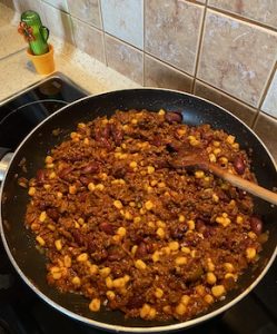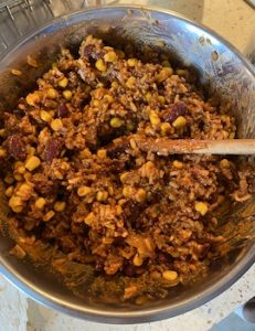 Mięso podsmażamy na patelni by wytopił się tłuszcz, a samo mięso lekko się zrumieniło, ale nie było suche. Następnie dodajemy koncentrat pomidorowy i podlewamy odrobiną wody, lub wlewamy gotową passatę pomidorową. W międzyczasie możemy ugotować biały ryż na sypko. Do mięsa zmieszanego z sosem pomidorowym dodajemy czerwoną fasolę, pół puszki proponuję zmiksować z tym płynem, w którym jest fasola, a połowę fasoli dodać w całych ziarnach oraz pół puszki kukurydzy. Farsz musi mieć konsystencję dość gęstą więc nie przesadźmy z ilością wody lub passaty pomidorowej, choć zawsze nadmiar płynu możemy odparować. Farsz mięsno pomidorowy doprawiamy do smaku solą, pieprzem i przyprawą chili con carne oraz jeśli ktoś lubi ostrzejsze smaki dodatkowo samym sproszkowanym chili. Niestety nie mogłem kupić chili con carne więc użyłem przyprawy do kuchni meksykańskiej. Do tak przygotowanego farszu dodajemy ugotowany na sypko ryż i całość mieszamy.