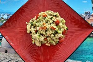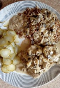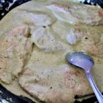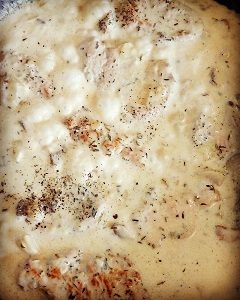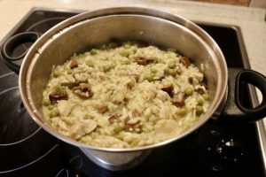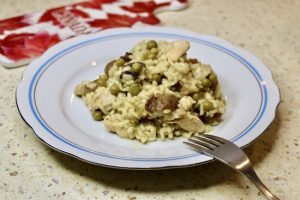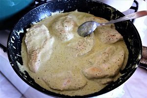 Dzisiaj przepis na proste szybkie i smaczne danie. Do przygotowania dania na dwie osoby potrzeba będzie dwa filety z kurczaka, mały kubek śmietany 18%, dwie lub trzy łyżeczki zielonego pesto, sól i pieprz do smaku. Filety przekrawamy wzdłuż na cieńsze plastry, wtedy szybciej się usmażą. Oprószone solą i pieprzem plastry kurczaka obsmażamy na oliwie, następnie dodajemy dwie lub trzy łyżeczki Pesto, kubeczek śmietany, podlewamy odrobinę wody i dusimy kilka minut na wolnym ogniu by sos nabrał jednolitej konsystencji i mięso doszło w środku. Oto cała filozofia tego przepisu. Ja podałem kurczaka z klasycznym kaszotto, które przygotowywałem po raz pierwszy. Przepis na kaszotto umieściłem już w jednym z wcześniejszych wpisów. Jeszcze jedna sprawa na koniec. Pesto samo w sobie jest dość słone i intensywne w smaku, proponuję więc najpierw dodać dwie łyżeczki, a jeśli stwierdzimy, że sos nie jest zbyt słony i intensywny w smaku możemy dodać jeszcze jedną łyżeczkę. Smacznego, próbujcie, gotujcie, wymyślajcie własne modyfikacje moich przepisów, gotowanie jest naprawdę super…