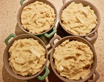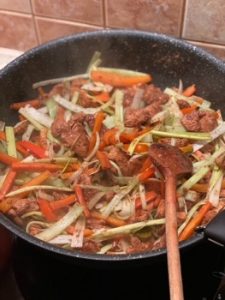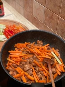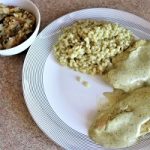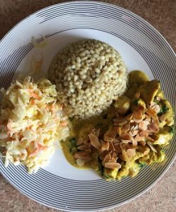 Kurczaka obsmażamy na mocno rozgrzanej patelni z dodatkiem kilku łyżek oleju, na tyle by nie był surowy w środku, doprawiamy solą do smaku. Następnie podlewamy mięso wywarem rosołowym na 3 filety z kurczaka wystarczy ¾ szklanki wywaru, w razie potrzeby zawsze możemy później jeszcze dodać odrobinę, jakby całość wyszła za gęsta. Mięso dusimy około 3 minut i kolejno dodajemy 3 łyżki jogurtu i tyle samo łyżek śmietany. Pamiętajcie jednak by wcześniej śmietanę zahartować w innym naczyniu z odrobiną gorącego sosu, śmietana dodana bezpośrednio na gorącą patelnię może się zważyć i dostaniemy rozwarstwiony sos. O jogurt nie musimy się martwić. Na koniec dodajemy sok z cytryny, to też musimy robić stopniowo, gdyż kwas soku może nam ściąć sos i zważyć zawartą w nim śmietanę. Całość dusimy jeszcze 5 minut by wszystkie smaki się połączyły, a sos nabrał kremowej, gęstej konsystencji. Po zdjęciu patelni z ognia dodajemy posiekaną kolendrę i całość mieszamy. W ten sposób kolendra nie straci aromatu i zielonego koloru, który jest doskonałym kontrastem do żółtego koloru dania. Po nałożeniu kormy na talerze posypujemy ją uprażonymi płatkami migdałowymi. Kormę zaserwowałem z surówką z białej kapusty, na którą podałem Wam przepis w poprzednim wpisie i z kaszotto z kaszy pęczak. Wydaje mi się, że lepiej pasowałaby kasza kus kus lub ryż, ale by dopasować się do gustów gości wykorzystałem tym razem pęczak.