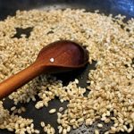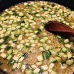 Gdy mamy przygotowane wszystkie składniki możemy zabrać się za kaszę. Kaszę na początku obsmażamy przez dwie do trzech minut z dodatkiem oliwy. Następnie wlewamy około szklankę wywaru, zmniejszamy ogień do minimum i co jakiś czas mieszając powoli gotujemy dopóki kasza nie wsiąknie prawie całego płynu. Gdy widzimy, że kasza wchłonęła cały wywar dolewamy kolejną porcję i co jakiś czas mieszamy. Po 10 minutach gotowania dodajemy pokrojoną w kostkę cukinię i dalej gotujemy 5 minut. Gdy ciecz zostanie wchłonięta dolewamy kolejną porcję. Po upływie tych 5 minut dodajemy pozostałe, obsmażone wcześniej składniki i gotujemy na małym ogniu jeszcze około 7 minut. Musimy próbować ziarenka kaszy, jeśli stwierdzimy że są wystarczająco miękkie to kaszotto jest już prawie gotowe. Pamiętajcie by pod koniec nie dodawać za dużo wywaru gdyż nasze kaszotto wyjdzie za rzadkie, lepiej dolać gdy będzie za gęste. Pod sam koniec dodajemy łyżeczkę masła i mieszamy do rozpuszczenia. Jeśli stwierdzimy, że kasza jest już ugotowana wyłączamy ogień i dodajemy starty parmezan. Przed dodaniem parmezanu kaszotto powinno być w miarę rzadkie, ser rozpuszczając się zagęści nasze danie, które nabierze kremowej konsystencji. Nie wiem jak to lepiej wytłumaczyć, danie nie może wyjść suche i zbite, parmezan z resztką wywaru powinien stworzyć coś w charakterze gęstego sosu, taka konsystencja jest idealna, jak nabierzemy na łyżkę i lekko obrócimy powinno powoli spływać, a nie utrzymywać się na łyżce. Nie używajcie zbyt dużo soli, gdyż parmezan sam w sobie jest dość słony, a i wywar z kostki rosołowej też jest słonawy. Świeżo mielony pieprz nada lekkiego pazura, gdyż wszystkie składniki same w sobie są łagodne w smaku.