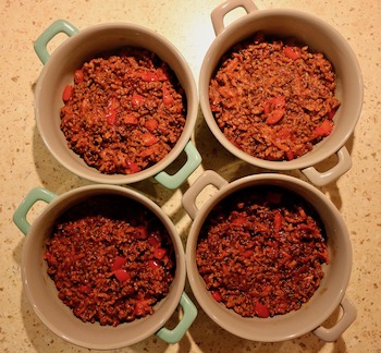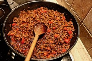 Mięso podsmażamy na patelni by wytopił się tłuszcz, a samo mięso lekko się zrumieniło, ale nie było suche. Następnie dodajemy koncentrat pomidorowy i podlewamy odrobiną wody, lub wlewamy gotową passatę pomidorową. W międzyczasie możemy ugotować biały ryż na sypko. Do mięsa zmieszanego z sosem pomidorowym dodajemy czerwoną fasolę, pół puszki proponuję zmiksować z tym płynem, w którym jest fasola, a połowę fasoli dodać w całych ziarnach oraz pół puszki kukurydzy. Farsz musi mieć konsystencję dość gęstą więc nie przesadźmy z ilością wody lub passaty pomidorowej, choć zawsze nadmiar płynu możemy odparować. Farsz mięsno pomidorowy doprawiamy do smaku solą, pieprzem i przyprawą chili con carne oraz jeśli ktoś lubi ostrzejsze smaki dodatkowo samym sproszkowanym chili. Niestety nie mogłem kupić chili con carne więc użyłem przyprawy do kuchni meksykańskiej. Do tak przygotowanego farszu dodajemy ugotowany na sypko ryż i całość mieszamy.