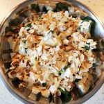 Zaczynamy od pieczarek i tofu. Pieczarki obieramy i kroimy w grubą kostkę, zarówno kapelusze, jak i ogony. Tofu kroimy w kostkę o boku jednego centymetra. Zarówno tofu, jak i pieczarki marynujemy około 2 godzin w sosie sojowym ciemnym. Następnie pieczarki i tofu przesmażamy na patelni. Pieczarki przesmażamy szybko na dużym ogniu z odrobiną oliwy, tak by zbytnio nie wyschły i zachowały swoją soczystość, lekko mogą się pojedyncze kawałki zrumienić. Tofu podsmażamy powoli na małym ogniu obracając pojedyncze kostki z każdej strony by nabrały złotego koloru. Podczas smażenia pieczarek i tofu możemy zużyć sos sojowy, w którym się marynowały, nabiorą jeszcze głębszego smaku. Pieczarki i tofu muszą przestygnąć przed połączeniem z resztą warzyw by te nie zwiędły od ciepła. Ogórka kroimy w grubą kostkę, paprykę podobnie, cebulę kroimy w pióra, pomidorki przekrawamy na połówki, oliwki możemy pozostawić w całości lub też poprzekrawać na połówki.