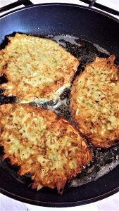 Póki jeszcze są dostępne ubiegłoroczne ziemniaki postanowiłem ostatnio upiec placuszki z cukinii i ziemniaków. Młode ziemniaki byłyby zbyt wodniste niestety. Na porcję dla 3 osób potrzeba trzy małe cukinie, trzy średniej wielkości ziemniaki, trzy jaja, około dwóch łyżek mąki, sól i pieprz do smaku. Cukinię i ziemniaki obieramy i ścieramy na tarce o grubych oczkach, lekko ugniatamy i odstawiamy na dwie minuty. Następnie odciskamy starte warzywa z nadmiaru soku, dodajemy jaja, mąkę oraz sól i pieprz. Ja jeszcze miałem przywiezioną z Krety przyprawę ziołową do ziemniaków, której dodatkowo użyłem. Prawdę mówiąc nadała ciekawy ziołowy aromat moim placuszkom. Placuszki smażymy na oliwie. Pamiętajmy by nie formować zbyt grubych placków, gdyż mogą się spalić z wierzchu, a w środku nadal pozostaną surowe, lepiej mniejsze i cieńsze, takie też łatwiej będzie nam przewracać. Placuszki smażymy na złoty kolor. Polecam placki po usmażeniu od razu odsączyć z nadmiaru tłuszczu na ręcznikach papierowych. Ot i cały przepis, a placuszki wyszły naprawdę przepyszne.