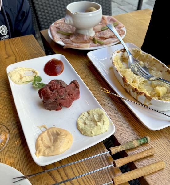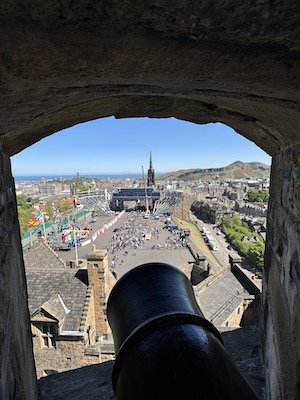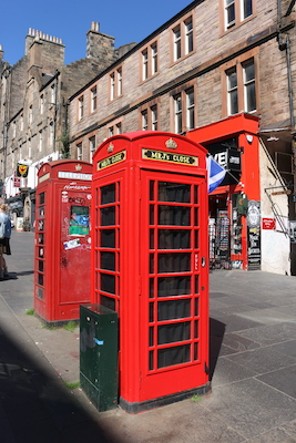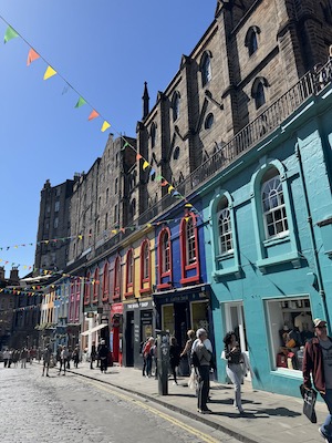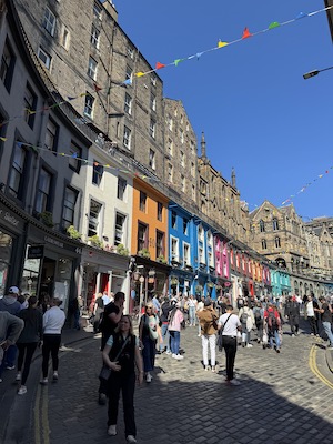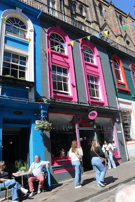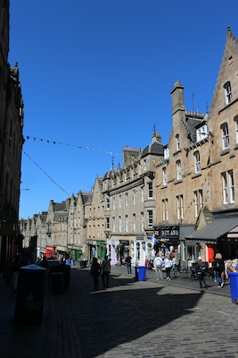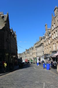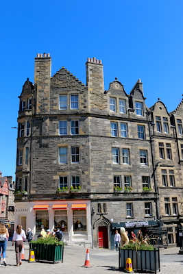 Wejście na zamek mieliśmy o godzinie 13.00 więc udało się nam zrealizować w całości przedpołudniowy plan spaceru. Żeby wejść na mury i pooglądać z góry panoramę miasta niestety trzeba mieć wykupione bilety. My standardowo pochodziliśmy po dziedzińcach wewnętrznych, murach, obfotografowaliśmy panoramę miasta, do samego zamku do środka nie weszliśmy już. Z zamku wybrałem już inną trasą powrotną, gdyż czekały na nas kolejne ciekawe zakątki miasta. Po wyjściu za bramy zaraz skręciliśmy w małą uliczkę w prawo i doszliśmy do Johnston Terrace, a następnie w lewo i po około 200 metrach zeszliśmy stromymi schodami do Grassmarket. To taki plac na długości dwóch przecznic ulicznych pełen pubów i restauracji, też polecam odwiedzić to miejsce. Na końcu Grassmarket skręciliśmy w lewo w W Bow i dalej Victoria St, cudowna, idąca po łuku ulica z bajecznie kolorowymi kamieniczkami. Jest to również obowiązkowy punkt odwiedzin podczas pobytu w Edynburgu. Tutaj też w restauracji Berties Prosper zjedliśmy obiad. Na zdjęciach w korytarzu możemy zobaczyć, jakie znane osobistości odwiedziły to miejsce.