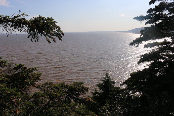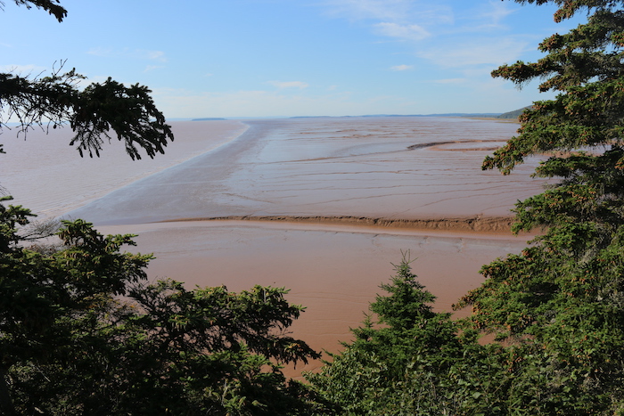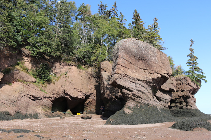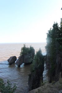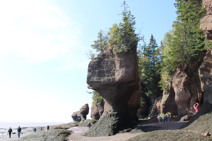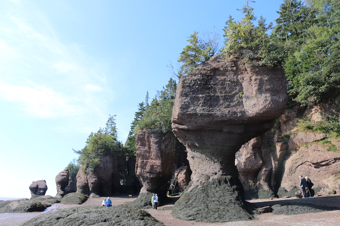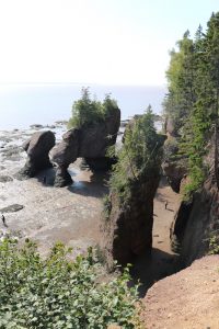 Moncton położone jest nad rzeką Petitcodiac, która wpada do Zatoki Fundy. W tej zatoce możemy obserwować największe odpływy i przypływy na świecie, sięgające kilkunastu metrów. Odpływ i przypływ możemy obserwować nawet w samym Montcon, ale zdecydowanie lepiej wybrać nie nad samą zatokę. Lustro rzeki obniża się o kilka metrów, a woda przybiera brunatnego koloru, od mułu stąd jej druga nazwa Chocolate River. Idealnym miejscem do obserwacji jest przylądek Hopewell. Największy odpływ jest między godziną 10 a 11, w tych godzinach przypadał przynajmniej około 20 września, czyli podczas naszego pobytu w Nowym Brunszwiku. Miejscem gdzie możemy obserwować to zjawisko jest Hopewell Rocks Park. Wstęp na teren parku, jeśli dobrze pamiętam kosztował 10 CAD na osobę. Odpływ i przypływ koniecznie trzeba zobaczyć zarówno z góry klifu, jak i z brzegu. Na sam dół zejdziemy schodami przy Low Tide Canteen. Gdy trwa odpływ możemy spokojnie spacerować między skałami, które podczas przypływu są zalane do wysokości kilku metrów. Po „dnie” zatoki możemy spacerować na odcinku około 1 kilometra, dochodząc do drugiego punktu widokowego przy High Tide Cafe. W tym miejscu jednak nie wejdziemy na górę. Znajduje się tu tylko platforma ratunkowa, w sytuacji kiedy byłoby już za późno na powrót do schodów prowadzących na górę. Możemy się tu ratować ucieczką, aż do kolejnego odpływu. Jeśli ktoś ma na tyle czasu, że może poświęcić cały dzień na Hopewell Rocks, może tu spędzić kilka godzin i obserwować najpierw odpływ, a potem przyglądać się jak stopniowo woda zalewa obszar, który wcześniej oddała lądowi. My nie mieliśmy na tyle czasu więc po spacerze po dnie zatoki pojechaliśmy w dalszą drogę na zachód, by jeszcze coś innego zobaczyć, a wróciliśmy tu już popołudniem, kiedy przypływ był najwyższy. Zobaczenia tego miejsca zarówno podczas przypływu, jak i odpływu robi ogromne wrażenie. Na szczęście to niesamowite zjawisko możemy zaobserwować w ciągu jednego dnia. Bez wątpienia to obowiązkowy punkt na mapie podróży przez Nowy Brunszwik.
