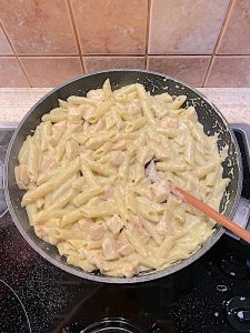 Odcedzony makaron dodajemy do sosu i jeszcze chwilę trzymamy na wolnym ogniu mieszając by cały makaron oblepił się sosem. Możemy jeszcze dodać kilka łyżek wody jeśli stwierdzimy że danie jest za „suche”. Z tego co czytałem, Włosi zawsze dodają tą wodę spod gotowania i mieszają jeszcze na patelni makaron z sosem. Tak przygotowane danie posypujemy na talerzach świeżo startym parmezanem. Smakuje przepysznie, polecam, sos śmietanowy z pesto doskonale pasuje do makaronu i kurczaka.