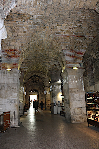 Wracając do samego Splitu, nie napisałem Wam jeszcze o jednym ciekawym miejscu na starówce, do którego trafiłem przez przypadek. Jest do Brązowa Brama, a raczej jej podziemia, którymi przejdziemy do ulicy Iza Vestibula. W odrestaurowanych podziemiach urządzony jest pasaż z pamiątkami, przypominający mi krakowskie Sukiennice. Nie są to zamknięte sklepiki, ale pojedyncze stragany sąsiadujące ze sobą, całość na noc zamykana jest kratami od strony wejść, półkoliste sklepienia posiadają ciekawą iluminację, która dodatkowo nadaje klimatu temu miejscu. Jest to miejsce warte odwiedzin, stąd to uzupełnienie poprzedniego wpisu o starówce.